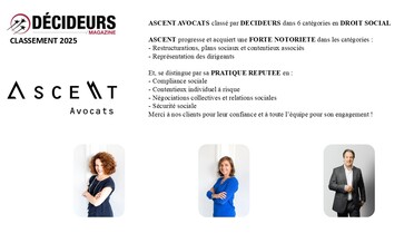 ASCENT est un cabinet d’affaires structuré autour d’un pôle de spécialistes en Droit social dédié aux entreprises et aux groupes français et internationaux, en conseil et en contentieux.